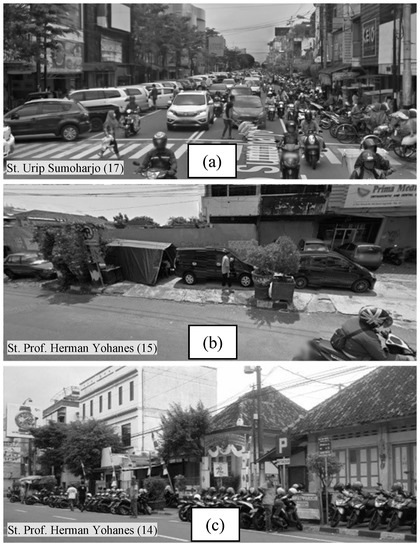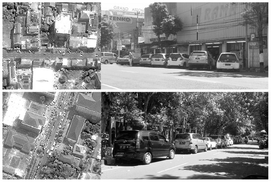 As shown on the left of Figure 1, two lanes on St. Urip Sumoharjo are used for illegal on-street parking: one for motorcycles and pedicabs and the other for passenger cars. Due to excessive parking demand, vehicles are sometimes parked in two lines on each side and even on sidewalks. The middle and bottom photos of Figure 1—which were taken on St. Prof. Herman Yohanes, another main street of the Gondokusuman District—show that passenger cars as well as motorcycles are parked on sidewalks. This sidewalk parking forces pedestrians to walk on automobile roads, which critically harms traffic safety [3,4,5].