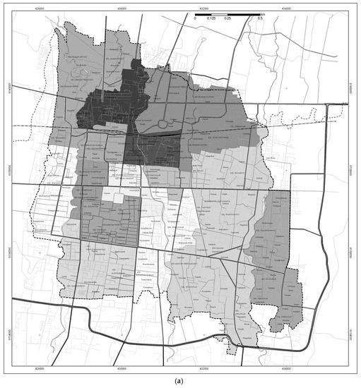 Yogyakarta City is the capital of the Special Region of Yogyakarta; this province is located in the central part of Java Island. In 2015, Yogyakarta City had a population density of 12,698 persons/km2 (area = 32.5 km2 and population = 412,704 persons) [1]. Yogyakarta City is the center of economy, education, tourism, and culture in the province. As presented in Figure 2, the Gondokusuman District (area = 3.99 km2) is one of 14 districts in Yogyakarta City. Around 85% of the district is built-up areas, mostly low-rise buildings. The district has the highest population in Yogyakarta City, 11.35% of its population [1].