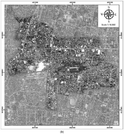 Study area. (a) Administration Map of Yogyakarta City; (b) QuickBird Imagery Map of the Gondokusuman District.