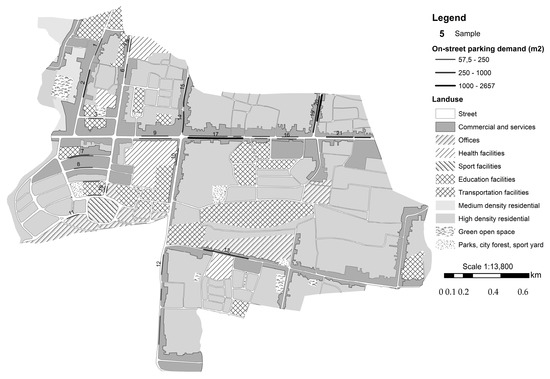 In Figure 5, which presents the entire street segments and land uses in the Gondokusuman District, the parking demand of each segment is also illustrated. In general, the highest parking demand is present in areas where the dominant type of parked vehicles is the motorcycle, including St. Prof. Herman Yohanes, St. Urip Sumoharjo, St. Affandi, and St. Laksada Adisucipto. The demand was around 447 m2 to 2657 m2, on average 231 motorcycles. The demand of most of these segments was more than twice of its capacity. Such a supply deficit has often led to parking rule violations (e.g., sidewalk parking).