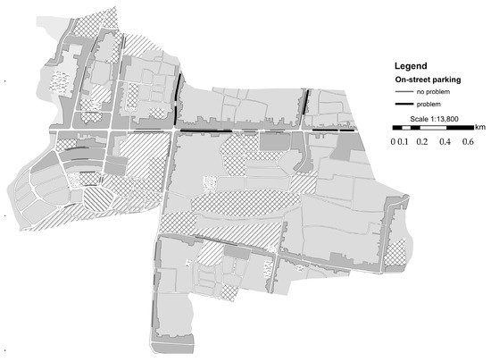 Figure 8 presents six street segments with a parking demand surplus. On a few segments, the demand for parking is twice as high as its capacity. As shown above in Table 3, the demand-supply mismatch is brought about by excessive motorcycle parking. In fact, in major Indonesian cities, motorcycle parking management is arguably a key to the success of parking management because if a parking area is full, passenger car drivers, unlike motorcyclists, explore alternative areas rather than forcefully parking their cars in the initially considered area. Owing to their small sizes, motorcycles are often parked on the roadway and sidewalk, close to the final destination.