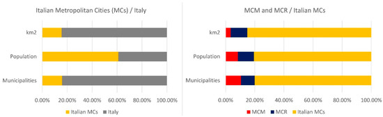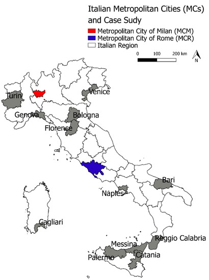 Metropolitan areas are defined by assessing the degree of functional integration between parts of the territory. In the Italian national context, the metropolitan issue refers to the consolidation of asymmetric interdependence between contiguous municipalities, where asymmetry is given by the presence of a larger municipality than the others whose forces of attraction structure the surrounding territories [53]. The “metropolitan areas” pursuant to art. 118 of the Constitution of the Italian Republic have undergone a major administrative-functional reorganization following the issuance of National Law 56/2014 (“Delrio Law”). In fact, this law established that the major Italian provinces should be replaced with Metropolitan Cities (MCs) as new government authorities in large urban areas. They are second-level institutions that are politically and functionally connected to the municipalities of their district. The “Delrio Law” established 10 MCs in Italy: Rome, Turin, Milan, Venice, Genoa, Bologna, Florence, Bari, Naples, and Reggio Calabria, excluding the regions with Special Statutes (Friuli Venezia Giulia, Sardinia and Sicily) (Figure 1).