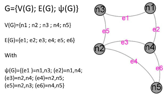 A graph is a mathematical structure for representing relationships (Figure 5). It is composed of nodes and edges, in which the nodes indicate elements and the edges indicate relations between nodes [58]. More formally, we can define a “G” graph as an ordered triple, which is composed of a nonempty set of nodes (n) designated as “V(G)”, a set of edges (e) designated as “E(G)” disjoint from “V(G)”, and the relations (Ψ) associated with each edge that connects two nodes [59]: