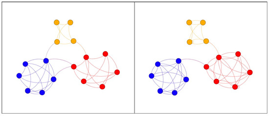 Example of Community Detection with three clusters of nodes (red, blue, yellow elements). On the left modularity (Q) = 0,51, on the wright modularity (Q) = 0,6. (source: authors elaboration).