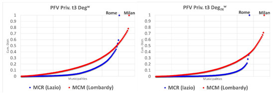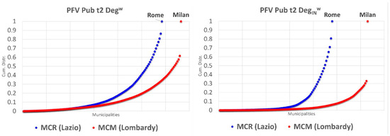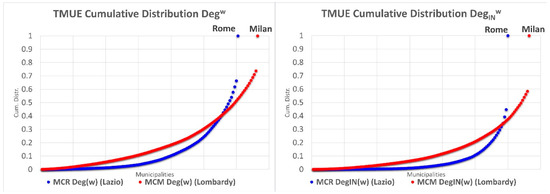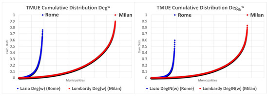In line with previous results, the TMUE analysis (Degw) and the TMUE analysis for incoming flows (DegINw) confirm the structural differences between the two metropolitan systems. In both cases, the cumulative Degw distribution highlights that 60% of the municipalities contribute to 10% of the total daily flow, and significant differences were observed in the behaviour of commuters in respect of the two mother cities. The city of Rome demonstrates a greater capacity to influence its region than the City of Milan in Lombardy. In fact, Rome is responsible for 20% of the total incoming and outgoing flows from all of the regional municipalities, while Milan has a lower exchange capacity with the other cities. The differences are particularly evident regarding the incoming commuting flow (DegINw). Over 40% of Lazio’s commuting flows converge on Rome, while Milan “captures” less than 20% of the regional flow (Figure 9).