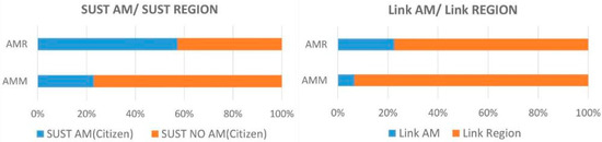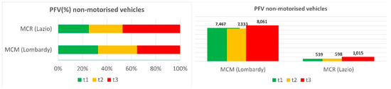 In both areas of analysis, the propensity toward non-motorized mobility appears limited in proportion to the total flow, even if it is higher in the MCM. This latter aspect confirms what some scholars have observed in different polycentric areas [78], probably thanks to a minor distance travelled. Moreover, in the MCM it was observed that commuting flows preferring non-motorized mobility create a larger and more articulated reticular structure.