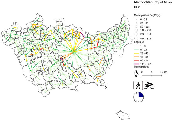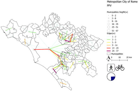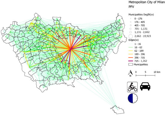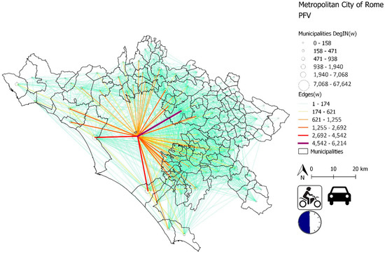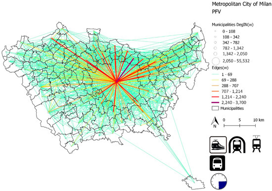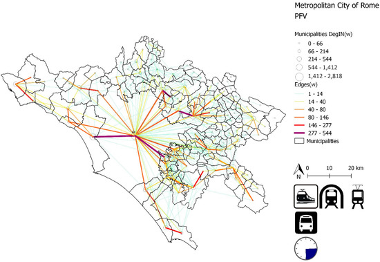 Subsequently, for the two metropolitan areas, the analysis was deepened by building specific commuting networks according to transport modes and duration of trip. In other words, a partial flow value (PFV) was calculated according to the means of transport used and the time required for the displacement.