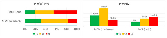 The MCR is composed of 121 municipalities that previously belonged to the province of Rome. The areas cover approximately 5300 square kilometres with a total of approximately 4,000,000 residents, and the density is 812 pop/kmq [57]. The economic productivity of this area is slightly lower than in the MCM (approximately 9% of Italian GDP). In Rome, there are concentrated service companies (especially the services for companies) that operate at national level, thus determining a specialization in the tertiary of the economy. It should be noted that the data is largely determined by the significant presence in Rome of the Administrations Power stations that alone contribute to the production of 20% of the added value. The metropolitan area is less densely populated than the MCM, with a weaker urban production system and a dispersed settlement pattern.