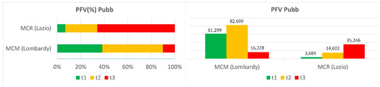 However, upon analysing the data of the two MCs in proportion to the largest regional network to which they belong, the preponderance of the MCR within Lazio for both of the populations that are involved (TMUE) and number of edges, is evident. Contrariwise, the MCM, which is clearly superior in absolute values to the MCR, shows a more limited influence within its region (Figure 12, Figure 13 and Figure 14).