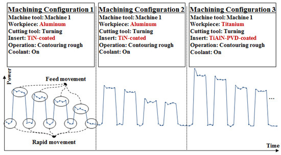 It should be noted that identical MCs should produce the same predictive model. Meanwhile, a different MC requires the use of a different model. For example, we can use the machine-monitoring data included in MCs 1 and 2 to create one predictive model, as shown in Figure 1, because the configurations are the same. On the other hand, we should use the machine-monitoring data included in MC 3 for making another model due to the use of different workpiece materials and tool inserts. These differences demand different SECs and result in different power values.