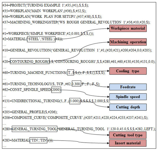 We need to identify data interfaces to extract instances of the PFD items from the machining data. In this paper, we use standard-based data interfaces to represent the machining data. We choose ISO 14649 (STEP-NC) as the data interface for extracting instances of the PFD items relevant to process plan data because it provides a comprehensive data model that contains what-to-machine and how-to-machine as well as machine tool descriptions. A STEP-NC program organizes a sequence of machining operations in terms of workingstep. In turn, each workingstep describes a machining operation associating instances of a tool, a strategy, a technology, and a machine function with a unique instance of a machining feature [24]. We can extract “machine tool model” from the entity device id defined in ISO 14649 Part 201 [36]. In turning machining, we can extract “cutting tool type”, “insert material”, “workpiece material”, “machining operation”, and “cooling type” from the relevant entities and attributes defined in Part 12 [37] and Part 121 [38]. Also, we can extract the input data, including “cutting depth”, “feed rate”, and “spindle speed” from the associated attributes in ISO 14649 Part 12. Figure 3 presents an example of the PFD extraction from a STEP-NC program. “Cutting diameter” is a changing parameter during machining and thus we extract it from the machine-monitoring data.