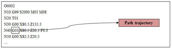 We choose ISO 6983 as the data interface for extracting PFD instances relevant to post-processing data. ISO 6983 specifies a machine-interpretable data format for positioning, line motion and contouring control systems used in an NC [39]. As shown in Figure 4, we can extract “path trajectory” from an NC program. G00 instructs rapid movement; whereas, G01, G02, and G03, respectively, instruct linear, clockwise-circular, and counterclockwise-circular feed movements.