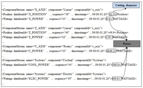 We choose MTConnect as the data interface for machine-monitoring data. The structure of MTConnect defines an information model in terms of the machine tool’s constituent axes, spindles, programs, and control sequences [2]. An MTConnect document includes: (1) a sample data item, which is the value of a continuous data stream at a point in time; (2) an event data item, which is an asynchronous change in state; and (3) a condition data item, which is the machine tool’s health and ability to function [40]. We can extract “cutting diameter” from each path position sample data item in the MTConnect document. We can extract “power consumption” from the summation of time-series wattage sample data items of machine tool components. Figure 5 shows an example of the PFD extraction from an MTConnect document.