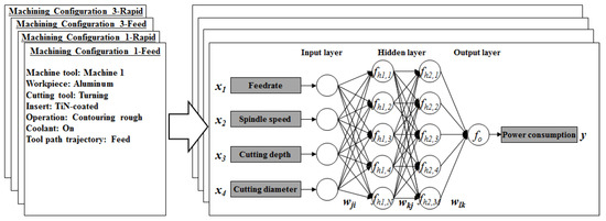 On the other hand, input data items and an output data item, respectively, correspond to input variables (x1, …, xn) and an output variable y to formulate a numerical function y = f(x1, …, xn). In the process planning phase, process planners have more flexibility in determining Q than that of Pmachine and k in Equation (3). Determining Q can vary with the selection of numeric values regarding the process parameters including feed rate, spindle speed, and cutting depth within the ranges recommended by textbooks and handbooks [34]. The changes in the process parameters influence Pcutting and in turn Ptotal. Thus, we can choose PFD items that can affect Q as input data items. We can categorize “cutting depth”, “feed rate”, “spindle speed” additionally with “cutting diameter”, which is one parameter determining Q, as input data items, as expressed in Equation (4). We can categorize “power consumption (Ptotal)” as an output data item because “power consumption” is an output metric of our predictive modeling. Thus, predictive models created by the proposed approach aim at predicting “power consumption” by specifying Q in a given MC. Table 1 presents the PFD list items described in Section 2.1.1 and Section 2.1.2. The extraction method of those PFD items is explained in Section 2.2.1.