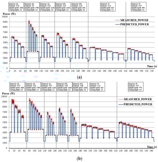 Figure 7. A comparison between the measured power and predicted power. (a) Power profiles on Machine 1; (b) Power profiles on Machine 2. - (2)