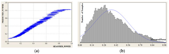 Figure 8. Power distribution and training data sample distribution (“Machine 1”, “TI”, “feed”). (a) A scatter plot of measured power and predicted power; (b) A distribution of training data samples.