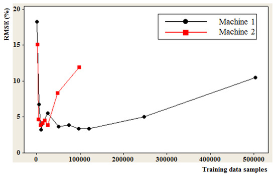 Another practical issue is the determination of the number of training data samples. There is no rigid rule for determining the number of training samples for power prediction using neural networks. Thus, we need to analyze the dependency between the number of training samples and statistical results for determining that number. We measure the change of the RMSE with regard to the increase of the number of training data samples. Figure 9 shows the trend graph that plots the numbers of training data samples and their corresponding RMSEs for the case of the TI material and two machine tools. As the sample sizes increase and the under-fitting of the ANN-based models decreases, RMSEs decrease to below 5% by about 6000 samples for Machine 1 and by 3000 samples for Machine 2. On the other hand, the ANN-based models start to increase the RMSEs when they, respectively, reach about 250,000 training samples in Machine 1 and about 50,000 training samples in Turning 2. This phenomenon is due to the over-fitting problem, which undermines a generalization ability of ANN-based models and can be caused from larger training data sizes than needed to solve the given problem [47].