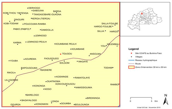 The study was conducted in Yatenga in the Northern region which is one of the CSV sites of CCAFS in Burkina Faso. It is a 30 km × 30 km block consisting of 51 villages (Figure 1). Geographically, the Northern region of Burkina Faso covers 16,130 km², representing 5.9% of the country. In 2015, the region had a population of 1,502,527 inhabitants (representing 8.5% of the total population of the country) with an average annual growth rate of 2.2% between 1996 and 2006. The population is young with 57.5% of the people under 20 years old. The region is the poorest in the country with a 68.1% poverty incidence [14]. The region’s economy is based on activities of the primary sector, focusing mainly on agro-sylvo-pastoral production, of which farming is by far the most dominant. However, both artisanal and industrial mining occupy an important place in the economy of the region. Agriculture in the region is mostly rain-fed subsistence systems that are characterized by small family farms. Sorghum and millet are the major staple crops. Cowpea, sesame, groundnut and vegetables are the main cash crops. Major agricultural constraints include the highly variable spatial and temporal distribution of rainfall and the inherently low fertility of the soils. The climate of the region is a Sub-sahelian type, characterized by the alternation of two seasons, a long dry season ranging generally from October to May and a short rainy season from June to September [15]. The annual rainfall ranges between 403 mm (in 1990) to 968 mm (in 2012) mm with an average of 672 recorded in the period: 1985–2014. For the past 30 years, about 50% of annual rainfalls have fallen below the 1985–2014 average.