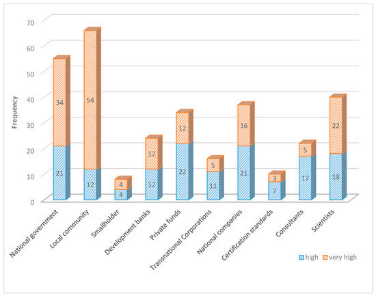 In the survey, almost all respondents (n = 66) highlighted and evaluated the importance of local actors such as communities as high (n = 12) or very high (n = 54). Half of the respondents saw governments as playing the second most important role (see Figure 1).