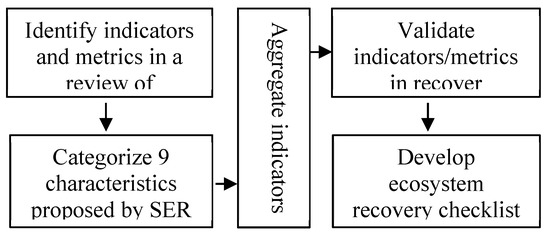 In this study, potential indicators were initially identified through a systematic review of the literature and categorized based on the Core Capabilities of the Society for Ecological Restoration (SER) International [12]. After aggregating the identified indicators, several methods were used to validate the final list including reviews of the literature, quarry or mining reclamation plans, and recovery plan case studies from CNKI (the largest Chinese literature database) and the Web of Science. A flow chart of the methodology follows (see Figure 1).