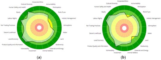 Based on the SAFA methodological approach, a rating is processed for each indicator ranging between “Best” (80–100%), “Good” (60–80%), “Moderate” (40–60%), “Limited” (20–40%) and “Unacceptable” (0–20%), at a level of data reliability ranging between a score of “1—High quality data” (for current data collected for SAFA or other sustainability measurement audits), “2—Moderate quality data” (for secondary or two year-old data) and “3—Low quality data” (for estimates or data over five years old). The SAFA system, finally, processes the data directly and outputs a series of graphical summaries.