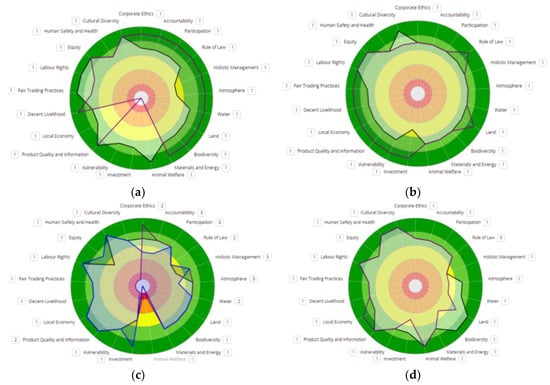 Comparison between levels of sustainability in in farms with “vegetables and fruit” and “vegetables and livestock” in the UAE and in Sicily (2017). (a) Vegetables and Fruit in the UAE; (b) Vegetables and Livestock in the UAE; (c) Vegetables and Fruit in Sicily; (d) Vegetables and Livestock in Sicily.