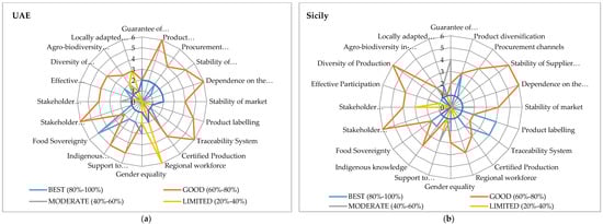 Overall, the macro-indicators assessed show positive scores for the two areas studied, with higher ratings for aspects such as “Human Safety and Health”, “Labour Rights”, “Local Economy”, “Product Quality and Information” in Sicily and “Equity”, “Labour Rights” and “Vulnerability” in the UAE. All of these indicators show performance scores ranging from 80 to 100 per cent (intense green area). These five indicators refer to two sustainability dimensions—“Economic Resilience” (“Product Quality and Information”; “Local Economy”; “Vulnerability”) and “Social Well-Being” (“Human Safety and Health”; “Labour Rights”)—that are directly connected with the general objective of the research, demonstrating relations with sustainability and food security, food sovereignty and organic farming practices.