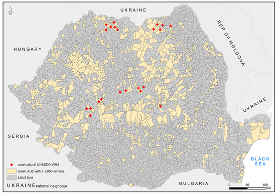 We used the smallest Local Administrative Units (LAU2, formerly NUTS-5 level) with statistical data, which in Romania are represented by urban and rural communes (administrative subdivision formed by one or several villages). For our study, we selected only the rural LAU2 with a cumulative value of at least 1000 tourist arrivals between 2001 and 2016 (Figure 1). Medium and big cities were excluded from the study because of their varied attractions and functions (business hub, for example) that could have biased the data. The impact of a WHS is easier to distinguish in the case of rural areas, as it often represents the only or the main attraction of the locality. Furthermore, the Romanian cultural WHS are mostly rural, only two of them being located in cities with more than 25,000 inhabitants.