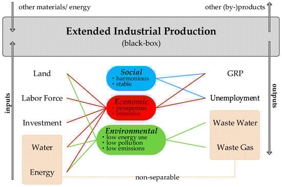 The industrial green transformation refers to a radical change in industrial sectors. This paper follows the definition of industrial green transformation in [16], especially formulating the indicator of its social attribute (unemployment), to measure the 30 regions’ dynamic efficiency of industrial green transformation in China. We focus on both ends (i.e., inputs and outputs side) of industrial production, and regard the interactive relationship of internal production as a black-box which is not the key of DEA measurement. The industrial green transformation meets the theory of triple bottom line, including social, economic and environmental dimensions. Variables should be selected appropriately, in consideration of the characteristics of the DEA method, so that variables do not carry repetitive information [31].