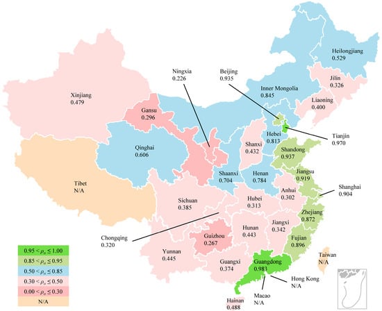 According to Equation (2) and its implication, the overall efficiency conveys the information about social, economic and environmental factors. From the literature review mentioned in the Section 1 (introduction), the mainstream of related studies decomposes the influencing factors into industrial structure, environmental regulation, technological innovation, energy structure, economic development level [45,46,47,48], to name a few. This paper will also use these similar indicators as influencing factors for the industrial green transformation. The sales output value share of pollution-intensive industry is selected to indicate the second industrial structure (X1). In China, the industrial water and air pollution are the most serious challenges for environmental governance. Accordingly, related and influential industrial sectors, including power, textile and paper [49], are regarded as the representatives of pollution-intensive industry. State-owned property has so large a proportion of the national wealth that we use the proportion of sales output value of state-owned industry in gross industrial sales output value to represent the ownership structure (X2). Endowment structure (X3) is measured by the capital-labor ratio of industrial sector. Data of capital is obtained with the method of perpetual inventory, and the ratio is via logarithmic processing. The productive service industry is usually defined as an industry which maintains the continuity of industrial production process, promotes the technological progress, and then improves the production efficiency. Thus, the concentration of productive service industry (X4) is selected as an influencing factor, measured by the proportion of employment in productive service industry. Investment in treatment of industrial pollution belongs to one of the forms of environmental regulation (X5). Here we use the proportion of environmental investment budget over regional GDP as an influencing factor to measure its contribution to the overall efficiency. The percentage of thermal power generation over total power generation (or total electricity consumption, taking the larger one) is one of the expression forms for energy structure (X6). The thermal power represents the energy consumption and conversion of coal-based fossil fuels, and the higher the percentage, the worse the clean energy use. The GDP per capita can be referred to as measuring the regional economic development level (X7). Meanwhile, we introduce the square of the GDP per capita in the model in view of the impact of EKC, and the logarithm is also taken for this variable. In addition, what needs to be stressed is that this paper does not adopt the technical progress due to the difficulty of its characterization. The number of scientific researchers and patents or R&D investment are mainly regarded as the variables of measuring the technical progress in relevant literature reviews [13,50], but it is not suitable for our research because of the missing data and inconsistent statistical caliber.