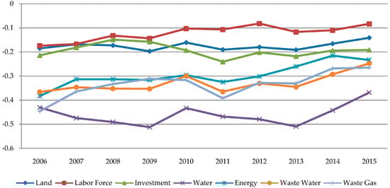 In the process of measuring the overall efficiency score, MaxDEA Ultra software is used to present the direction of slack movement of all variables and calculate their projection values. With these data and Equation (11), we can acquire the average FEI of the 30 regions in China between 2006 and 2015 (Figure 3). Resource and pollution mainly refer to the economic and environmental attribute of industrial green transformation, including land, labor force, investment, water, electricity and land, as well as waste water and waste gas. From the line chart, all variables’ FEI is beneath 0, which indicates that there needs to be a reduction for the observed values of these variables in order to make resource consumption and pollution emissions more efficient. Among all the above indicators, FEI of labor force is the closest to the horizontal zero line, which explains that the efficiency of labor force is relatively the best; while water obtains a minimum value of FEI, it needs a great improvement to reach the goal of projection value. The performance of the remaining indicators is somewhere in between.