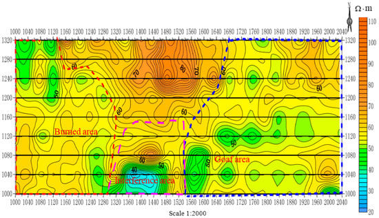 After decades of mining, innumerable goafs have been formed in the SDMA. These goafs are widely distributed and vary in size. In addition, there are no complete, detailed records and data on the scope and state of most of these goafs. However, it is necessary to understand the specific distribution and state of the goafs for prevention of risks and mitigation of their consequences within the goaf areas. Hence, we first conducted a basic data collection and field survey. To obtain a more accurate distribution of the goafs, geophysical exploration, including application of the EH4 magnetotelluric method and high-density resistivity method, and drilling were performed [19]. When interpreting geophysical data, we should make repeated comparisons with the drilling results and geophysical characteristics to perform a comprehensive analysis to determine the distribution of the goafs more precisely and accurately. Due to space limitations, this paper introduces only some of the survey results. Figure 3, Figure 4 and Figure 5 show examples of the results obtained through these methods. From these results, we can identify the goaf area, the waterlogged area, the burned area, etc.