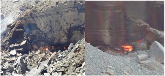 There is a large amount of space in the room mining goaf. The airtightness of this space is poor, and shallow surface cracks can also pass through the goaf, causing the goaf to undergo air leakage for a long time. Due to the large number of coal pillars and floating coal that are left from room mining, the entry of oxygen greatly increases the possibility of spontaneous combustion of the remaining coal pillars and floating coal in the areas that have been mined. The coal seam may cause spontaneous combustion or deteriorate and lose value if recovered, as shown in Figure 11. The situation of spontaneous combustion of the coal seam in the mine will not only seriously affect the safe exploitation of the adjacent coal mines and the lower coal within this mine, but also waste many valuable resources and cause severe pollution of the environment.