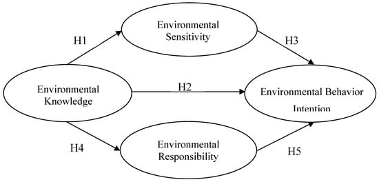 Additionally, there is past research confirming that environmental knowledge indirectly influences environmental behavior [38,48,49,50]. Wang, Liu, and Qi explored the relationship between these variables with sustainable consumption behavior, including environmental knowledge, environmental responsibility, environmental sensitivity, environmental value, perceived behavioral control, and response efficacy. Their results showed that environmental knowledge positively affected behavioral intentions and impacted sustainable consumption behavior through behavioral intentions [35]. According to these study findings, Hypothesis 2 is proposed.