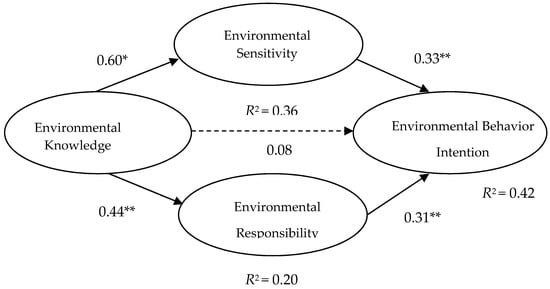 A further analysis was performed to clarify the direct and indirect effects in the proposed model for the mediating effects of environmental sensitivity and environmental responsibility. Table 6 shows that the total effect of environmental knowledge on environmental behavioral intentions was 0.42 (t = 6.94 **, p < 0.01), indicating environmental knowledge improved environmental behavioral intentions. The total mediating effects of environmental sensitivity and environmental responsibility on the relationship between environmental knowledge and environmental behavior intentions was 0.34 (t = 6.26 **, p < 0.01). Together, the results clarified the mediating effects of environmental sensitivity and environmental responsibility on the relationship between environmental knowledge and environmental behavioral intentions.