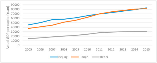 China’s economy has maintained rapid development more than 30 years after the reform and opening-up policy. In 2010, China surpassed Japan and became the second largest economy in the world. Although the extensive mode of development has led to rapid economic growth, it has also caused serious damage to natural resources and the ecological environment. In recent years, the continuous extreme haze weather across the country has seriously affected the people’s physical and mental health. As a major heavy industry base in China, the Beijing–Tianjin–Hebei area and its surrounding areas have many high-pollution industries such as steel, chemicals, cement, etc. The world’s urban air quality data, which was published by World Health Organization (WHO) in May 2017, showed that the Beijing–Tianjin–Hebei region occupies the top nine positions among cities with the highest density PM2.5 in China: Xingtai, Baoding, Shijiazhuang, Handan, Hengshui, Tangshan, Langfang, Cangzhou, and Tianjin. Beijing is not in the top 10; it ranks 11th. Cases of such serious and centralized pollution are very rare. Related research studies have shown that serious particulate pollution is closely related to human genome variations, respiratory diseases, and cardiovascular diseases [1,2,3,4]. Furthermore, environmental pollution also has an adverse influence on the sustainable development of the economy, since the development of the regional economy must consume certain environmental resources, which refers to the exploitation of natural resources and the emission of pollutants. However, there is an upper limit regarding the ecological environment’s ability to hold the pollutants produced by human productive activities. Once the discharged pollutants exceed the quantity that the natural environment can purify by itself, it will cause enormous damage to the ecological environment, and the sustainable development of the economy cannot be achieved. National atmospheric environmental-bearing capacity research based on new air quality standards have shown that 70% of 330 prefecture-level cities in China have overloaded atmospheric environments, and the most serious overloaded areas include the Beijing–Tianjin–Hebei region and its surrounding areas [5]. Therefore, some actions to improve the quality of the atmospheric environment are urgently needed.