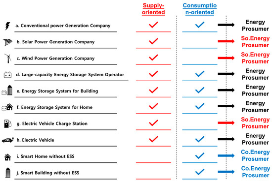 In this paper, we make 10 classifications of the energy domains within the smart city. The energy domain acts as an energy prosumer among the objects connected through the power system network in the smart city. Additionally, we classify each energy domain as to whether it is supply-oriented or consumption-oriented. These classifications can be seen in Figure 2 below. Energy domains that were both supply-oriented and consumption-oriented were energy prosumers, and energy domains that satisfied only one of the supply or consumption classifications were either supply-oriented or consumption-oriented energy.