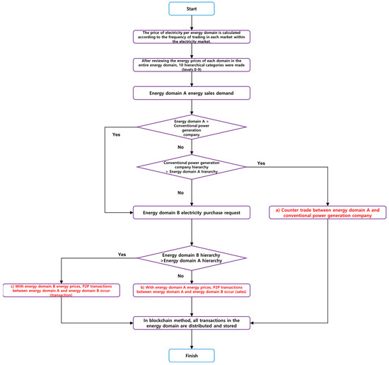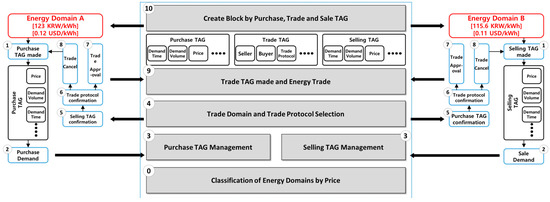 Figure 4 illustrates an overview of how energy transactions on the blockchain-based energy transaction platform are made between the seller and buyer. Energy domains are initially classified based on the current price, and the purchase or selling tags for each transaction are made. According to the current domain price hierarchy and purchase/sale demand, the trade domain and trade protocol undergo selection. Once the selection is made, the purchase/sale confirmation tag is confirmed by the seller and buyer, and the trade protocol is confirmed, which is when the ledger and block are generated to validate the transaction. Finally, once all the transactions are made, the block with information of the transaction added to the chain.