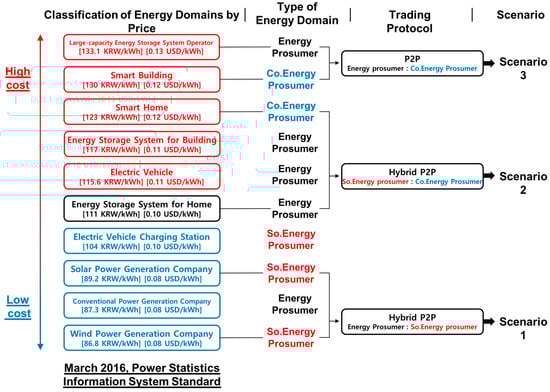 In this section, we will introduce classification and trading scenarios of energy domains. In Section 3.3, we made 10 classifications of energy domains. The 10 domains were then organized into either prosumer-oriented energy, consumer-oriented energy or supply-oriented energy. In this section, we take this classification and further organize the energy domains based on energy price, type of energy domain and trading protocol, and then provide a scenario for the trade.