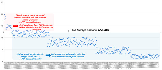 Because each smart home household collects energy for itself and consumes the self-collected energy first, a couple of potential cases must be introduced. In one case a household classified as Group A may consume 5 kWh of energy throughout one day, while the home ESS charges and collects 12.8 kWh for that day. That household then is left with a surplus of 7.8 kWh of energy, which it can sell to another household on the suggested blockchain-based P2P energy-transaction platform. Another case introduces the scenario in which a household consumes 18 kWh of energy throughout one day. This household is classified as Group F and needs to purchase 6.8 kWh of energy since the home ESS only charges and provides 12.8 kWh. Like the two cases provided above, households classified as Groups A, B, C, and D (partial), will be able to sell energy on the P2P transaction, whereas households classified as Groups D (partial), E, and F will purchase energy on the P2P platform.