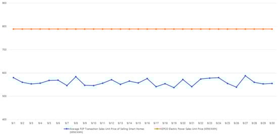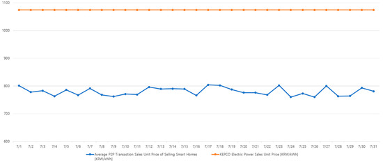 Once the sellers and buyers of an energy transaction are determined, the P2P energy transaction unit price was simulated to always be 70~90% cheaper than the flat unit price set by KEPCO, which is visualized in Figure 8 and Figure 9. The prices generated were randomly generated to represent unit price variation that exists in the suggested blockchain-based P2P energy transaction. Figure 8 and Figure 9 compare the unit price of P2P energy transaction to the KEPCO electric power sales unit price.