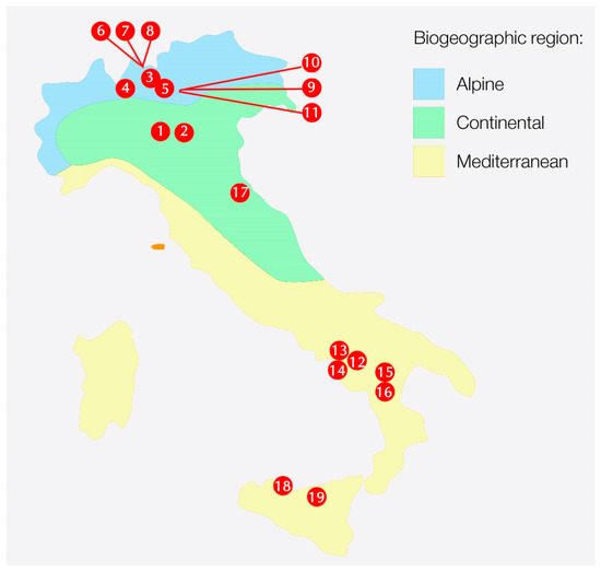 As stated in Article 114 of the Italian Constitution, the Republic “is composed of the Municipalities, the Provinces, the Metropolitan Cities, the Regions and the State. Municipalities, provinces, metropolitan cities and regions are autonomous entities having their own statutes, powers and functions in accordance with the principles laid down in the Constitution”. In the context of the Italian Natura 2000 network different institutions and authorities are directly and indirectly involved in management. Regions are usually in charge of managing Natura 2000 sites, but they can empower Provinces and the latter, in turn, can delegate to local administrative authorities (such as Municipalities, Mountain Communities, etc.) or also private organizations. They can adopt different kinds of instruments: from management plans and integrative conservation measures within existing planning instruments such as a landscape plan, hydrogeological system plan, pasture plan, etc. to administrative or contractual measures [15]. In the Lombardy Region, where eight out of the selected sites are located, ERSAF (Regional Agency for Services to Agriculture and Forests) is the body in charge of the management, protection and development of forests, even though in some cases the management of sites has been delegated to the provincial administration and national protected areas. In the other Regions, Natura 2000 sites are in national protected areas where the Park authority is responsible for their management (i.e., Regions of Campania, Calabria, Basilicata, Emilia Romagna and Marche).