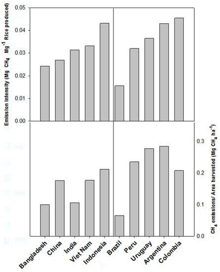 An overview on GHG emissions and emission intensities from rice production systems in Asia and LAC was determined using FAOSTAT data [5] (Figure 1). Emissions reported in Figure 1 were quantified using activity data disaggregated into irrigated, rain-fed and upland water regimes. Where available, country specific emission factor (EF) values were used [36]. For Asian countries with no default EF value, an area-weighted average EF (15.7 g CH4 m−2 yr−1) was used. For the LAC region, the global Intergovernmental Panel on Climate Change (IPCC) EF value (20 g CH4 m−2 yr−1) was used. The EF values were modified by the application of a scaling and correction factor for water regimes and organic amendments, respectively. According to FAOSTAT, a scaling factor of 0.7 was used for rain-fed rice and 0 for upland rice or dry conditions [37]. In addition, for the FAOSTAT data, a default correction factor of 2 was used for organic amendments for all countries [37] Results from this very coarse data suggest that emissions are lower in Brazil that in the other major rice producing countries in Asia and LAC. However, results from field studies conducted in the LAC region indicate wide variation in methane emissions (0.3–64 g CH4 m−2 yr−1) suggesting that over-reliance on the IPCC’s default emission factors may either overestimate or underestimate GHG emissions from rice production systems in the different LAC countries. In the next section, we will discuss how several of the technological options and management practices used by rice farmers may influence GHG emissions in LAC countries.