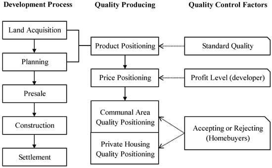 The collective housing development process in a presale housing system is sequentially: land acquisition, product planning, presale housing, construction, and settlement. Product type, pricing, communal area, and quality items and facilities are typically determined during the stages of land acquisition and production planning. In Taiwan, housing prices and property registration include communal and private areas and facilities. Subsequently, developers calculate construction costs and determine HQ by subtracting land cost, management and sales costs, and profit from the local housing price.