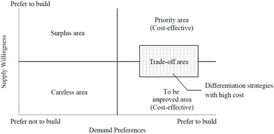 Differentiation emphasizes the provision of unique value to the customer. When customers are satisfied with the quality of the product, they are more willing to pay a price equivalent to or exceeding the quality [21,30,31]. Therefore, quality differentiation is defined as the provision of value other than that required to satisfy standardized housing products in the present study. Developers are less willing to provide such benefit, which includes unique designs, facilities, equipment, materials, and services. A matrix with demand (X-axis) and supply preferences (Y-axis) can be depicted (see Figure 2) to address the relationship between the differentiation strategies of the two sides. Demand preferences mean that the level at which homebuyers regard these differentiation strategies as important items, and prefer to have these items in their housing. Supply willingness mean the developers’ willingness to provide differentiation strategies after considering the construction cost, time, and technology difficulty. In other words, differentiation items that are not preferred by homebuyers should not be considered. These items can be allocated to the “Surplus area” or “Careless area”.