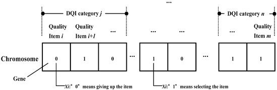 Implementing the GA entails a set of trial solutions that are coded as chromosomes. A chromosome is composed of genes representing variables (quality items). Each chromosome is evaluated on its performance with respect to the fitness function. The ones with better performance are more likely to survive than the ones with worse performance. This evolutionary process of genetic information is preceded by crossover, and perturbed by mutation. The result is a new generation with better survival abilities. The process is repeated until the chromosomes in the new generation are identical, or certain termination conditions are reached [35]. For the chromosome structure, as illustrated in Figure 4, the value of a variable is specified as the content of the gene, which means the quality item selections (the items of improving housing quality from the framework of the DQI, see Table A1) in this study.