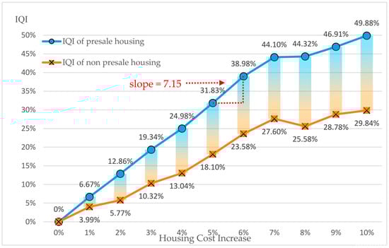 In Figure 5, slopes were illustrated in order to define the cost performance of the quality improvement strategies (quality improvement performance per 1% increase in the homebuyers’ budgets). The greater the slope, the better the quality improvement effect. The results indicated that the slope achieved 7.15 when the homebuyers’ budgets increased by 6%, achieving the optimal quality improvement effect. Diminishing the marginal benefit was exhibited once the budget was increased by 8%. The slope at 8% was only 0.21, exhibiting the least favorable quality improvement effects. In other words, paying a higher unit price could not guarantee a proportionate return on the HQ. The analysis results also verified that that the homebuyers’ average willingness to increase their budget by 8.33% is an inefficient investment, and that favorable HQ improvement effects are achieved during the presale housing stage. Figure 5 shows that the IQIs of non-presale housing were substantially lower than those of presale housing. This is because a portion of the quality items cannot be changed once construction is complete, regardless of the amount that homebuyers are willing to pay. Therefore, benefits can be maximized if HQ and satisfaction are improved at the planning and design stages by incorporating participation strategies and considering homebuyers’ HQ opinions. The result is consistent with some studies that revealed that housing providers should regulate their housing activities and design accuracy at the original design stage in order to suit households’ needs and wants by examining factors that account for housing satisfaction or dissatisfaction [2,3,4].
