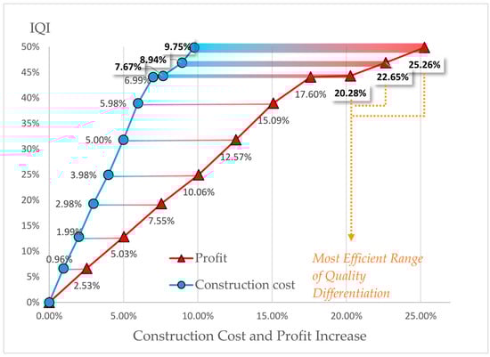 The relationship between profit and IQI are simulated in order to identify the incentives for developers to adopt quality differentiation strategies (see Table A4). The initial expected profit of the case developer was $14,197,604 USD. This value is set as the origin of profit increase (0%) in order to examine the changes in construction cost and quality after quality differentiation strategies are implemented.