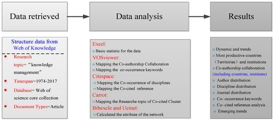 In this study, we present a bibliometric profile of KM. In addition, some research tools were used in this study. For example, we used Bibexcel to construct a co-occurrence matrix [43]. Citespace was used for co-citation analysis [44]. Ucinet [45] and Vosviewer [46] were used for social network analysis and visualization and Carrot was used for cluster analysis [47]. Other tools such as Excel were also used for basic statistical analysis and visualization of the bibliometric results. To evaluate the present KM situation, some indicters were used in this paper. For instance, frequency is one of the most commonly used indicators in the bibliometric knowledge domain and is considered the main indicator that highlights the present situation in a research field. Some network indicators were also used in this paper, such as degree centrality and betweenness centrality [45]. The reason for choosing these indicators was that they were also the most commonly used indicators in knowledge network analysis. For the emerging trends analysis, a method was introduced by Chen [44] that combines modularity and a burst index. This method is widely used and has been proven to be able to detect the emerging research trends in other domain. The overall approach and methodology is shown in Figure 1.