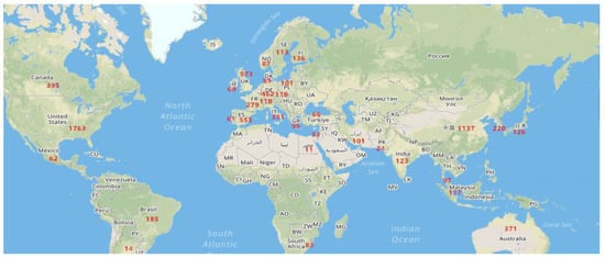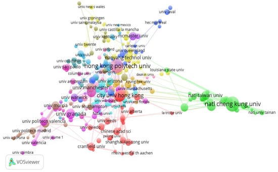 Then the top 297 institutions with more than or equal to 10 publications were chosen for our collaboration network analysis. The collaboration network map displayed in Figure 5 was created using VOSviewer. In the collaboration analysis, we were concerned about the collaboration frequency between two institutions. In Figure 5, the thickness of the linking lines between the two institutions is directly proportional to their collaboration frequency.